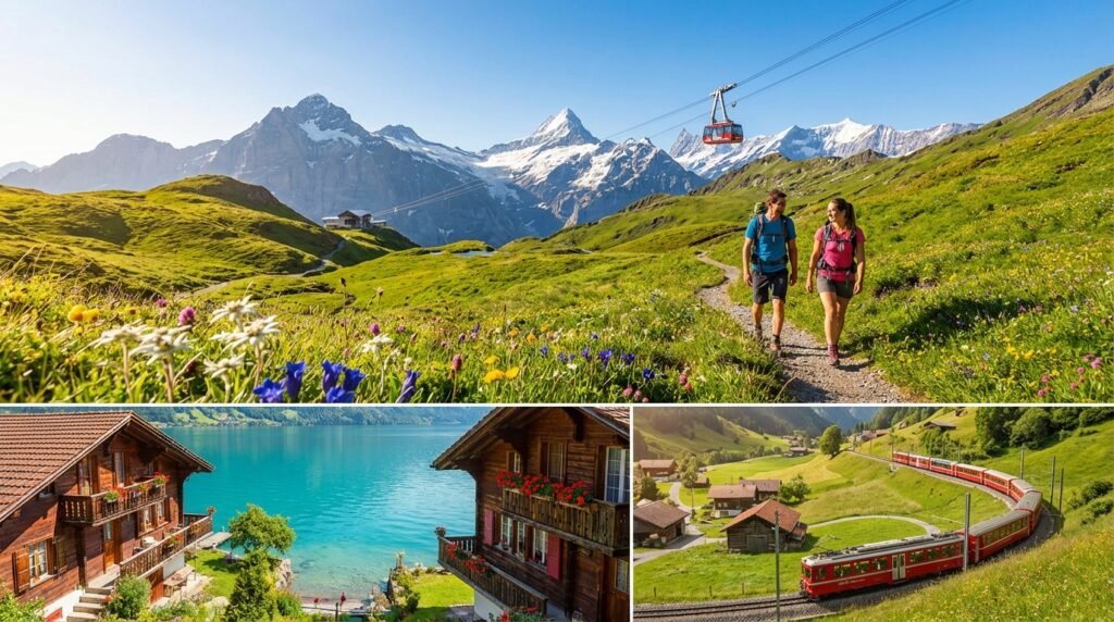 The Swiss Alps in late spring and early summer offer an extraordinary contrast: snow-capped peaks above, wildflower meadows below. June is particularly magical when Alpine flowers carpet valleys in riots of color, mountain passes open after winter, and temperatures (15-22°C) are perfect for hiking and scenic train rides.